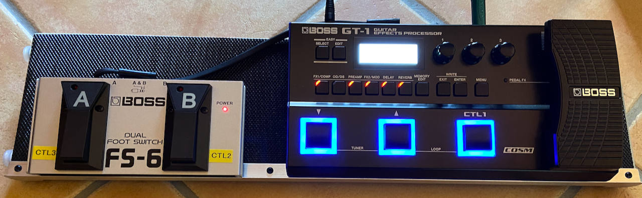 En PJ la photo de l'ensemble GT1 - FS6, sur un pedalboard de fabrication maison.