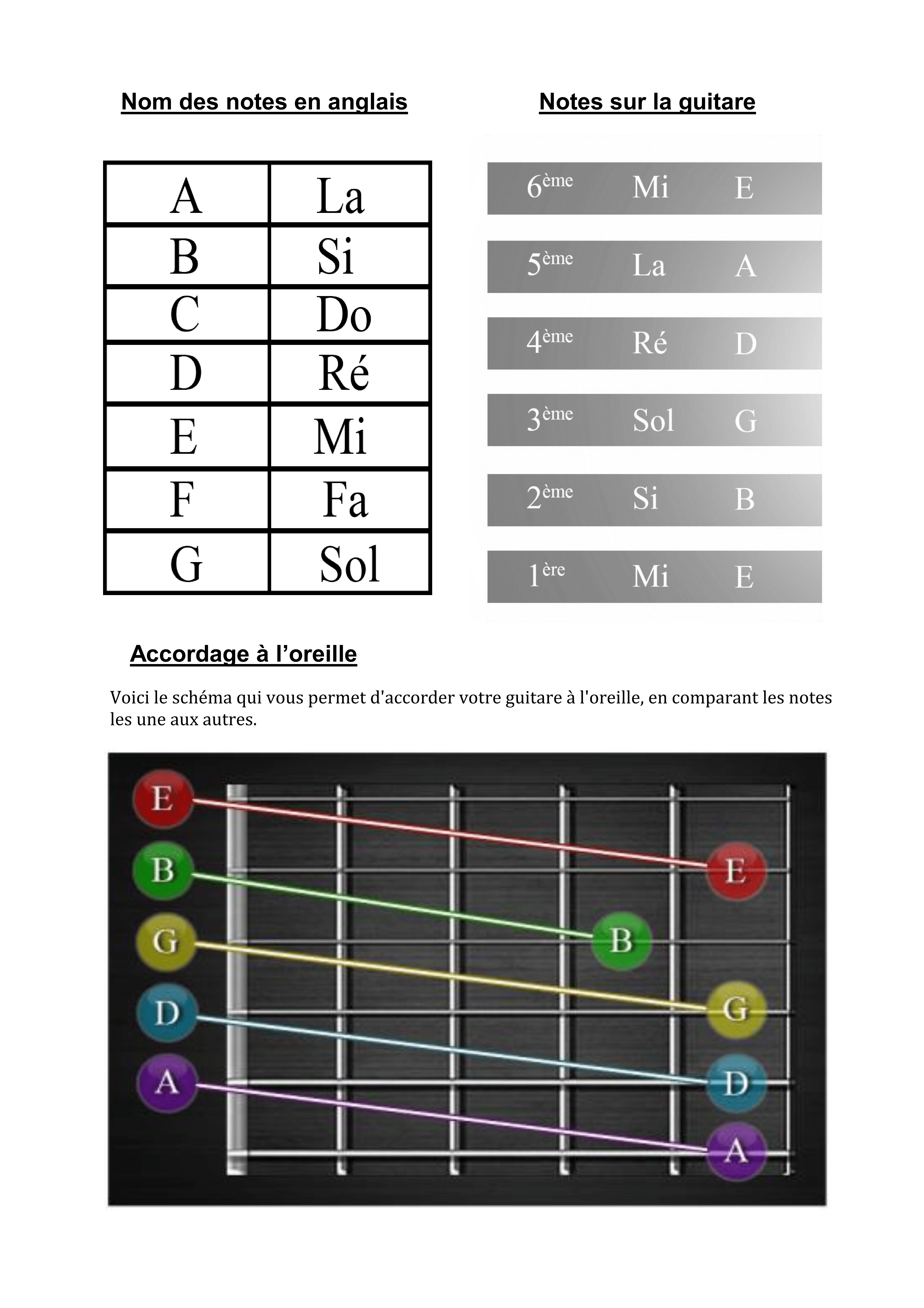En effet, sur la plupart des partitions ou tabulations, l'écriture utliisée est l'anglophone. Apprenez donc par coeur ces noms de cordes afin de gagner du temps lorsque vous lirez vos schémas.