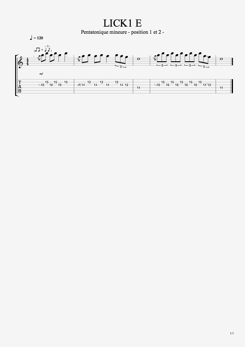 Lick de guitare sur la pentatonique mineure de E qui utilise les positions 1 et 2.