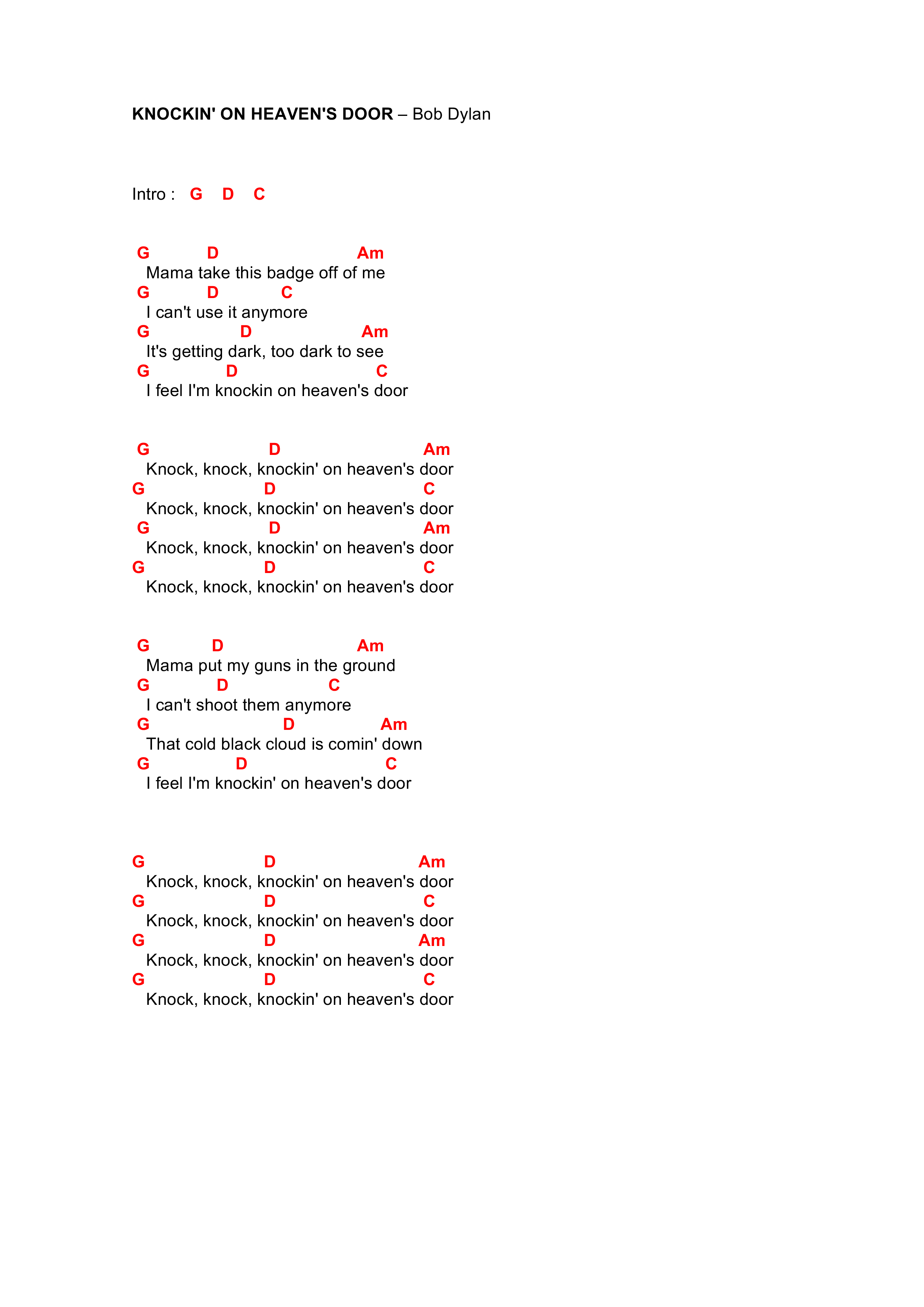 LES ACCORDS DE KNOCKING ON HEAVENS DOOR